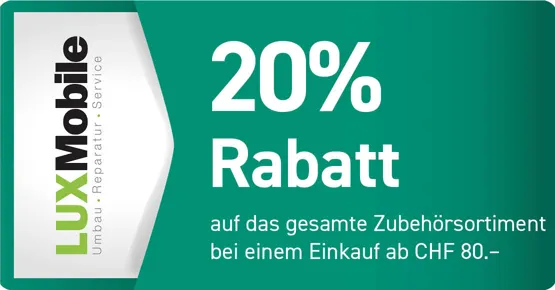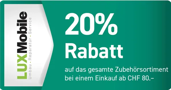 Auf das gesamte Zubehörsortiment bei einem Einkauf ab CHF 80.–. Nur in der LUXMobile Filiale im Pilatusmarkt Kriens einlösbar. Gültig vom 25.08.2025 bis 11.10.2025.