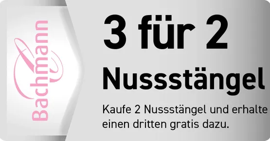 Kaufe zwei Nussstängel und erhalte einen dritten gratis dazu. Nur in der Confiserie Bachmann Filiale im Pilatusmarkt Kriens einlösbar. Gültig vom 25.08.2025 bis 11.10.2025.