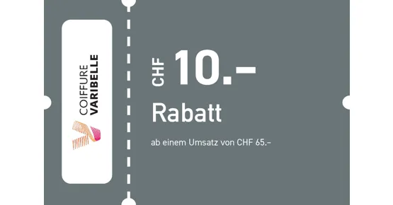 Rabatt gegen Vorlage dieses Bons einlösbar bei COIFFURE VARIBELLE im Pilatusmarkt. Eine Serviceleistung muss im Umsatz enthalten sein. Nicht kumulierbar mit anderen Rabatten. Gültig vom 02.03.2026 – 02.04.2026. Nur einlösbar im Pilatusmarkt