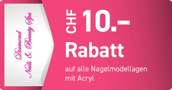 Auf alle Nagelmodellagen mit Acryl. Nur in der Diamond Nails & Beauty Spa Filiale im Pilatusmarkt Kriens einlösbar. Gültig vom 25.08.2025 bis 11.10.2025.