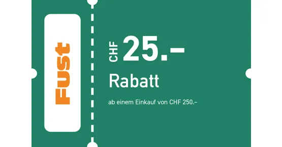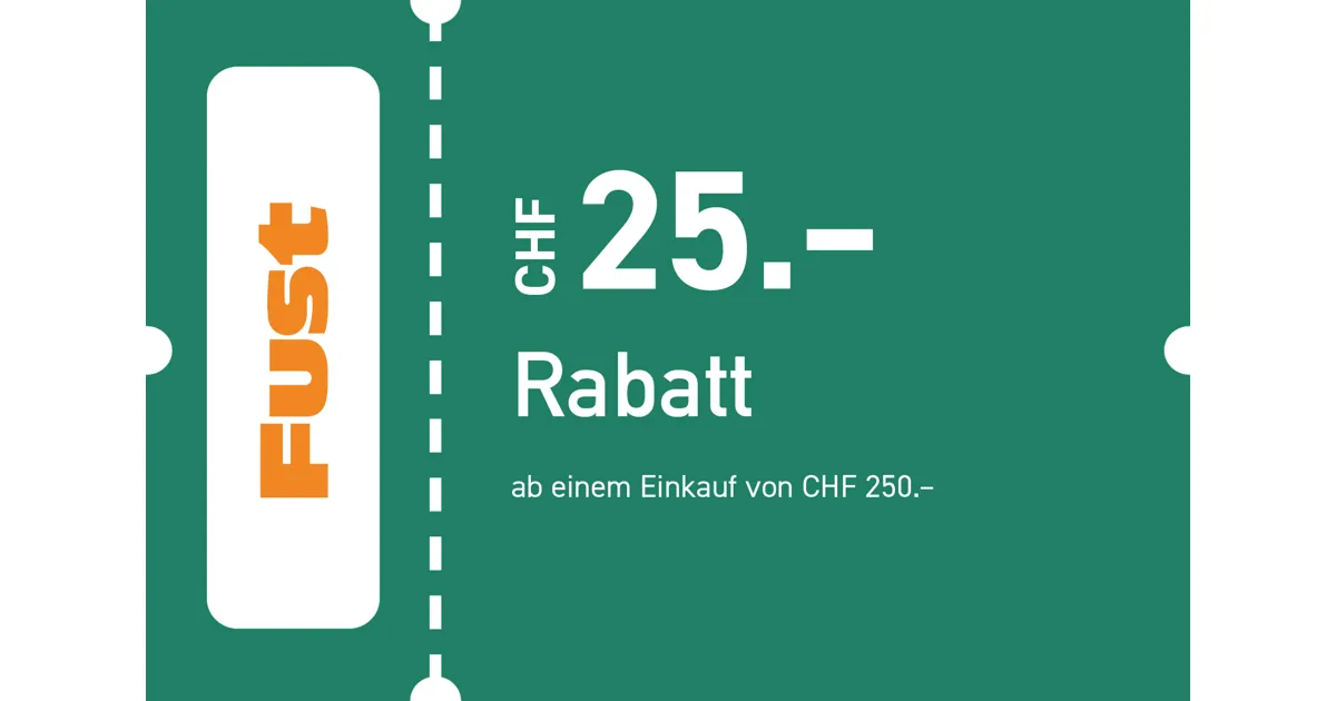 Auf gesamtes Produktsortiment ab einen Einkauf von CHF 250. Ausgenommen: Dyson-Produkte, iPhones, Fust Küchen&Bäder, Dienstleistungen, Abos, Geschenkgutscheine und Wertkarten. Einlösbar in Ihrer Fust-Filiale Pilatusmarkt. Nicht kumulierbar, nur einmal einlösbar.