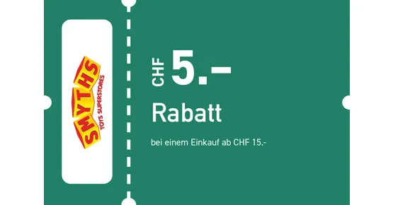 Online nicht einlösbar. Coupon nicht gültig für Windeln, Bücher, Spielkonsolen, Software und Geschenkkarten. Keine Barauszahlung möglich. Nur ein Coupon pro Kunde und Einkauf. Bei Einlösung bitte den Coupon an der Kasse vorlegen. Es werden ausschliesslich Originalcoupons akzeptiert. Eine Veröffentlichung und/ oder Vervielfältigung des Gutscheins im Internet oder auf sonstige Weise ist nicht gestattet. Ein Angebot der Smyths Toys AG, Industriestrasse 29, CH 8305 Dietlikon, Schweiz.